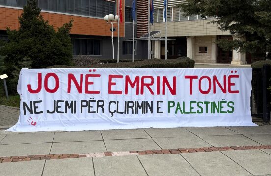 Organizata “Kolektivi për mendim dhe veprim feminist” kanë vendosur sot në hyrje të presidencës së Republikës së Kosovës një baner me mbishkrimin “Jo në emrin tonë, ne jemi për çlirimin e Palestinës”, duke kundërshtuar kështu vendimin e Kosovës për t’iu bashkuar Bordit të Paqes së themeluar nga SHBA-të.