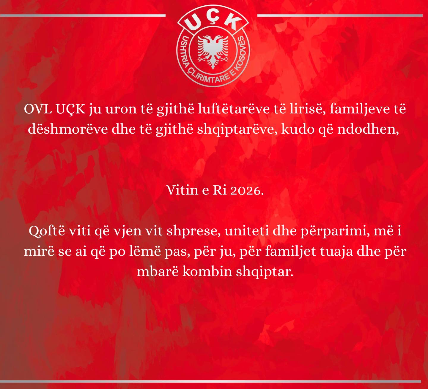 Organizata e Veteranëve të Luftës së UÇK-së, ua ka uruar të gjithë shqiptarëve Vitin e Ri 2026-të, në veçanti, luftëtarëve të lirisë, familjeve të dëshmorëve dhe gjithë shqiptarëve kudo që ndodhen.