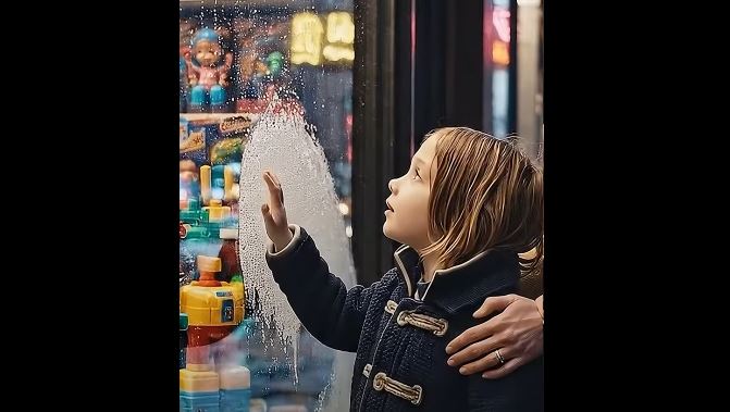 Në video shihet një fëmijë me nënën e tij, të dy të mërzitur, që po arrijnë të blejnë një lodër në dyqan.