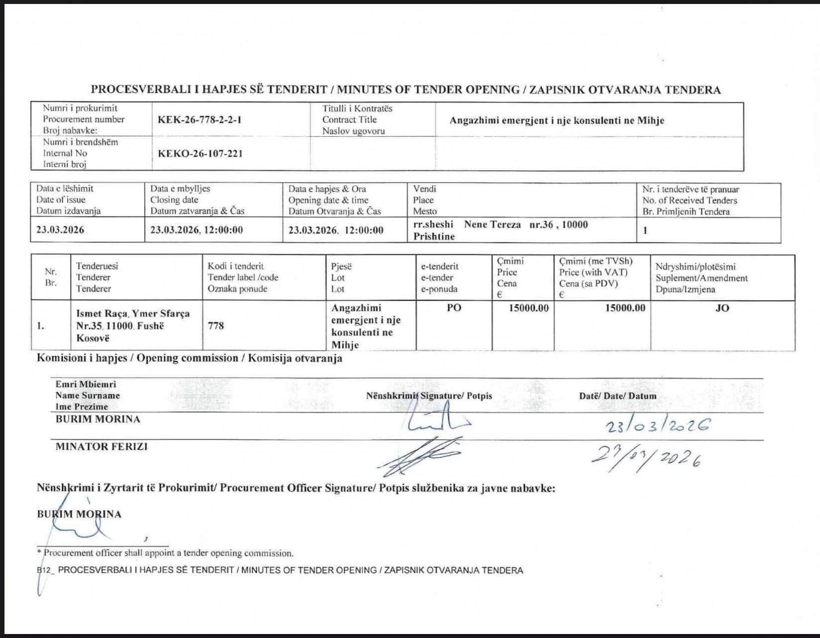 Dokumentet e prokurimit tregojnë se Raça ishte i vetmi ofertues në tender, duke siguruar pagesë rreth 2,500 euro në muaj, raporton lajmi.net.