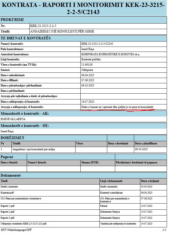 Në vitin 2023, kontrata e Raçës prej 11,400 euro ishte ndërprerë para kohe. Në dokumentet zyrtare të e-prokurimit, arsyeja është e shkruar për “sjellje jo të mira”.
