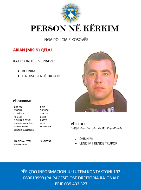 Policia e Kosovës, Drejtoria Rajonale e Policisë në Pejë, bazuar në autorizimin e organit kompetent për publikimin e fotos së personit të kërkuar më Letërreshtim, me qëllim lokalizimin dhe rrjedhimisht arrestimin e tij, lëshon Kërkesë për bashkëpunim me qytetarët.