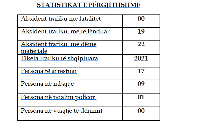 Sipas këtij raporti, në këtë periudhë nuk ka pasur asnjë aksident trafiku me fatalitet, ndërsa janë regjistruar 19 aksidente me të lënduar dhe 22 aksidente me dëme materiale.