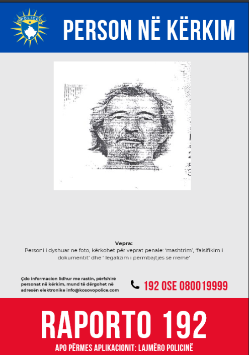 Policia e Kosovës në Pejë bazuar në ligjin për publikimin e fotos sё personit të kërkuar, me autorizimin e Prokurorisë Themelore nё Pejё, me qëllim lokalizimin dhe rrjedhimisht arrestimin e tij, ka lëshuar kërkesë për bashkëpunim me qytetarët.