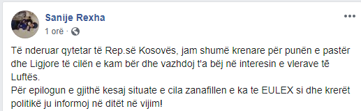 Për epilogun e gjithë kësaj situate e cila zanafillen e ka te EULEX si dhe krerët politikë ju informoj në ditët në vijim!”, ka shkruar ajo.