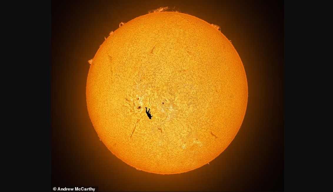 Një fotograf i specializuar në imazhe të diellit ka realizuar një prej fotove më të pazakonta dhe spektakolare të viteve të fundit: një parashutist që duket sikur bie drejt Tokës nga vetë sipërfaqja e diellit.