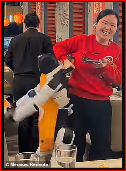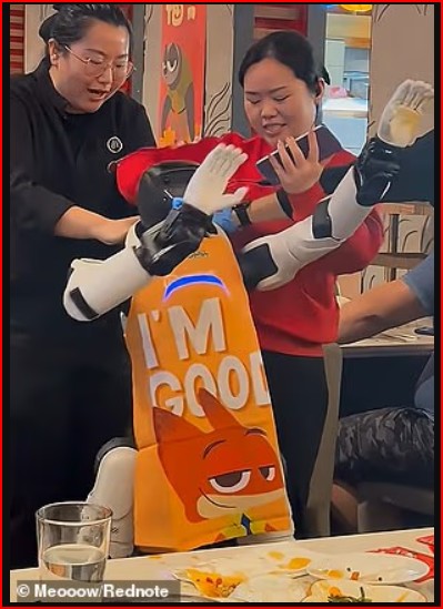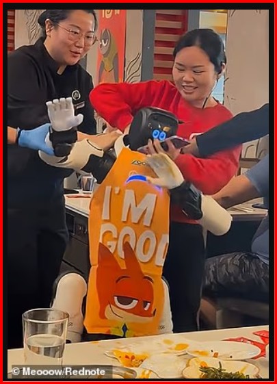 Klientët po shijonin vaktet e tyre kur roboti filloi të shfaqte lëvizje kërcimi. Gjatë një rutine kërcimi, duke tundur krahët dhe duke lëvizur belin, ai papritmas godet tavolinën me duar, duke bërë që kungujt dhe salca e verdhë të fluturojnë në ajër. Stafi vrapoi menjëherë për ta fikur.