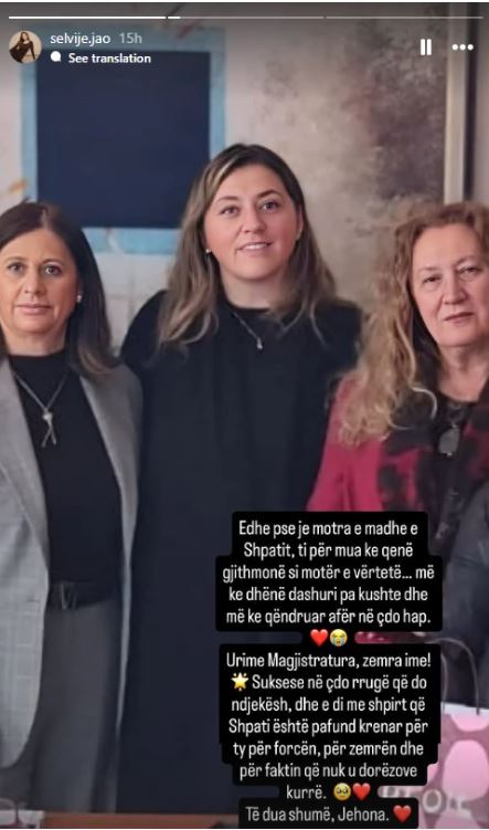 Tutje tha: “Urime magjistratura, zemra ime. Suksese në çdo rrugë që do ndjekësh, dhe e di me shpirt që Shpati është pafund krenar për ty për forcën, për zemrën dhe për faktin që nuk u dorëzove kurrë. Të dua shumë Jehona”.