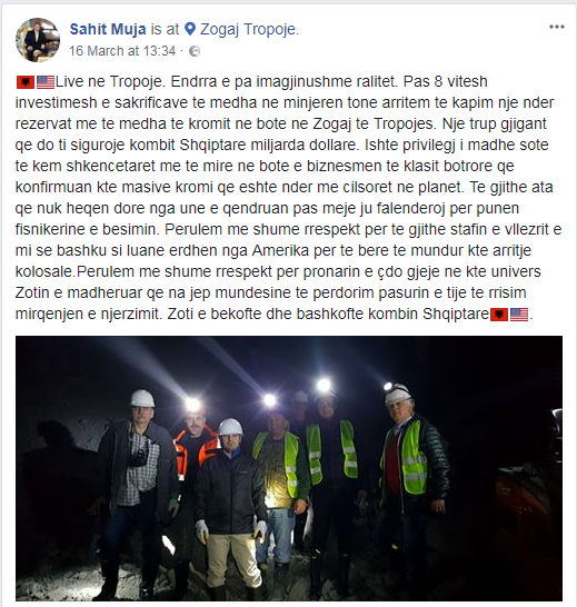 I tillë duket edhe rasti i një biznesmeni me emrin Sahit Muja i cili mbrëmë deklaroi me bujë nëpërmjet një postimi në fb e tij, se ia kishte dalë me kompaninë e tij të zbulonte një ndër rezervat më të mëdha të kromit në botë, në një minierë në Zogaj të Tropojës.