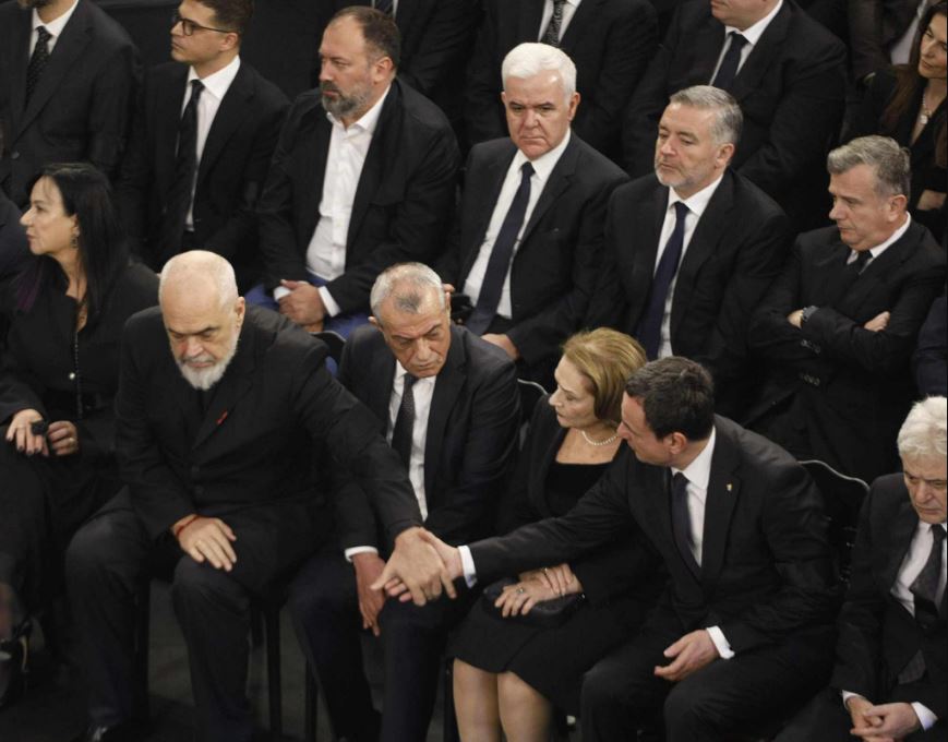 Në homazhe po marrin pjesë edhe dy kryeministrat, Edi Rama dhe Albin Kurti, të cilët si rrallëherë janë parë duke i shtrënguar dorën njëri-tjetrit.