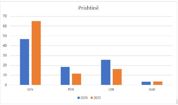 Lidhja Demokratike e Kosovës në rezultatet preliminare në kryeqytet ka arritur ti marr 25.54 për qind të votave, derisa në rezultatet përfundimtare në zgjedhjet parlamentare të vitit 2021 kishte arritur t’i marr 16. 27 për qind.