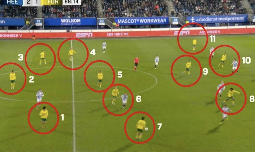 Në minutën e 88-të, Fortuna Sittard kreu një zëvendësim të dyfishtë, duke sjellë në fushë Darijo Grujcic dhe Owen Johnson në vend të Ryan Fosso dhe Jasper Dahlhaus. Megjithatë, Dahlhaus nuk e la menjëherë fushën dhe vazhdoi të luante për rreth një minutë, duke bërë që Fortuna të kishte 12 lojtarë në fushë. Gjatë kësaj periudhe, ata fituan një goditje nga këndi, nga e cila Rodrigo Guth shënoi golin e barazimit në minutën e 90-të.