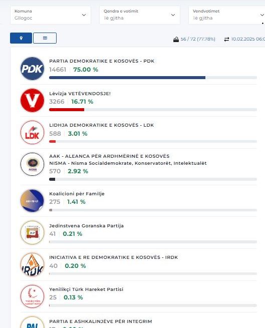 Sipas rezultateve preliminare të publikuara nga Komisioni Qendror i Zgjedhjeve dhe nga 77.46 përqind e votave të numëruara, ky subjekt politik renditet i pari me 74.89 % ose me 12 mijë e 601 vota, pasuar nga Lëvizja Vetëvendosje me 2134 vota ose 12.68 përqind .