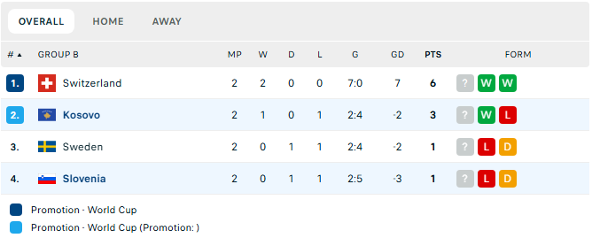 Pas dy xhirove të para në kualifikimet për Kupën e Botës 2026, Zvicra kryeson grupin me 6 pikë, pas dy fitoreve radhazi dhe një bilanci mbresëlënës golash 7:0.