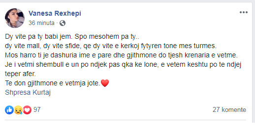 “Je i vetmi shembull e un po ndjek pas qka ke lone, e vetem keshtu po te ndjej teper afer.”, ka shkruar mes tjerash Vanesa për babain e ndjerë.