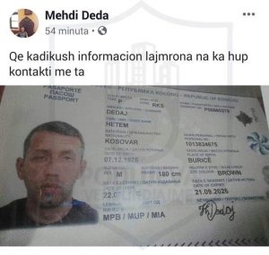 Familja Dedaj nga fshati Buricë i Podujevës, kërkojnë ndihmë nga qytetarët nëse marrin informata apo e takojnë në ndonjë vend Hetem Dedaj (në foto është fotoja dhe të dhënat e tij personale), ta njoftojnë familjen e tij.